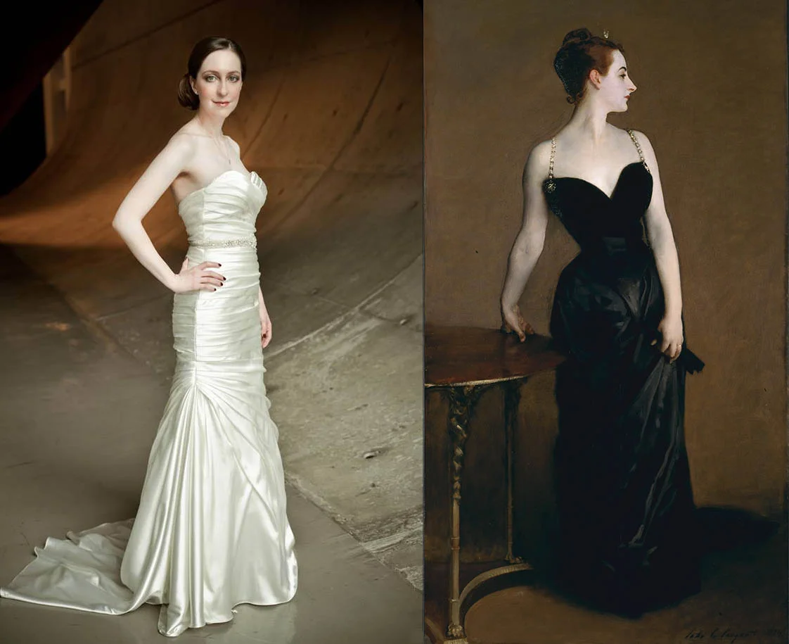 On the left: Wedding Photograph by Merrilee Luke-Ebbeler. On the right: John Singer Sargent, Portrait of Madam X, 1884.