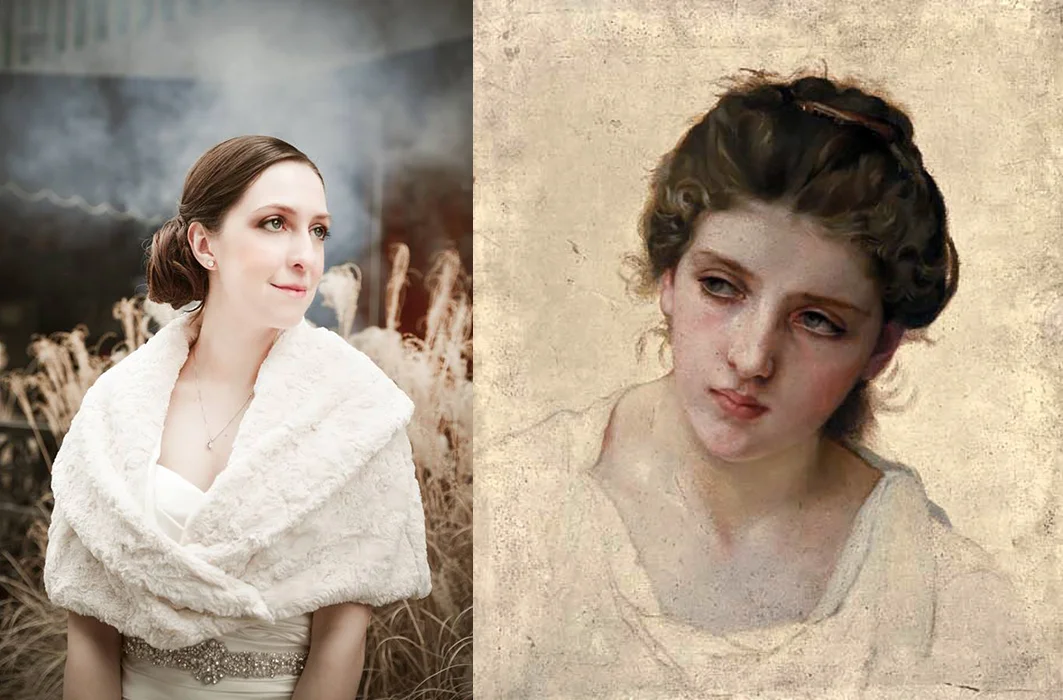 On the left: Wedding Photograph by Merrilee Luke-Ebbeler. On the right: William-Adolphe Bouguereau, Study of the Head of a Blonde Woman.