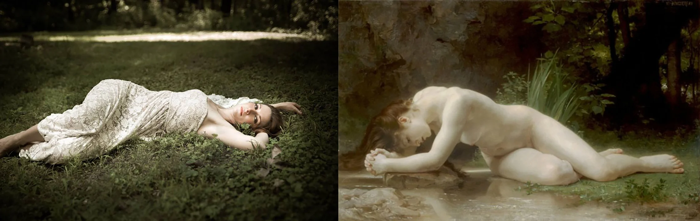 On the left: Wedding Photograph by Merrilee Luke-Ebbeler. On the right: William-Adolphe Bouguereau, Biblis, 1884.