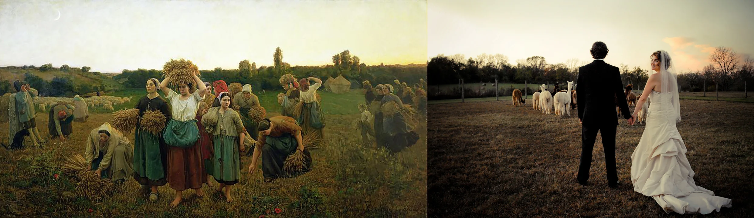 On the left: Jules Breton, The Return of the Gleaners, 1859. On the right: one of my wedding photographs.