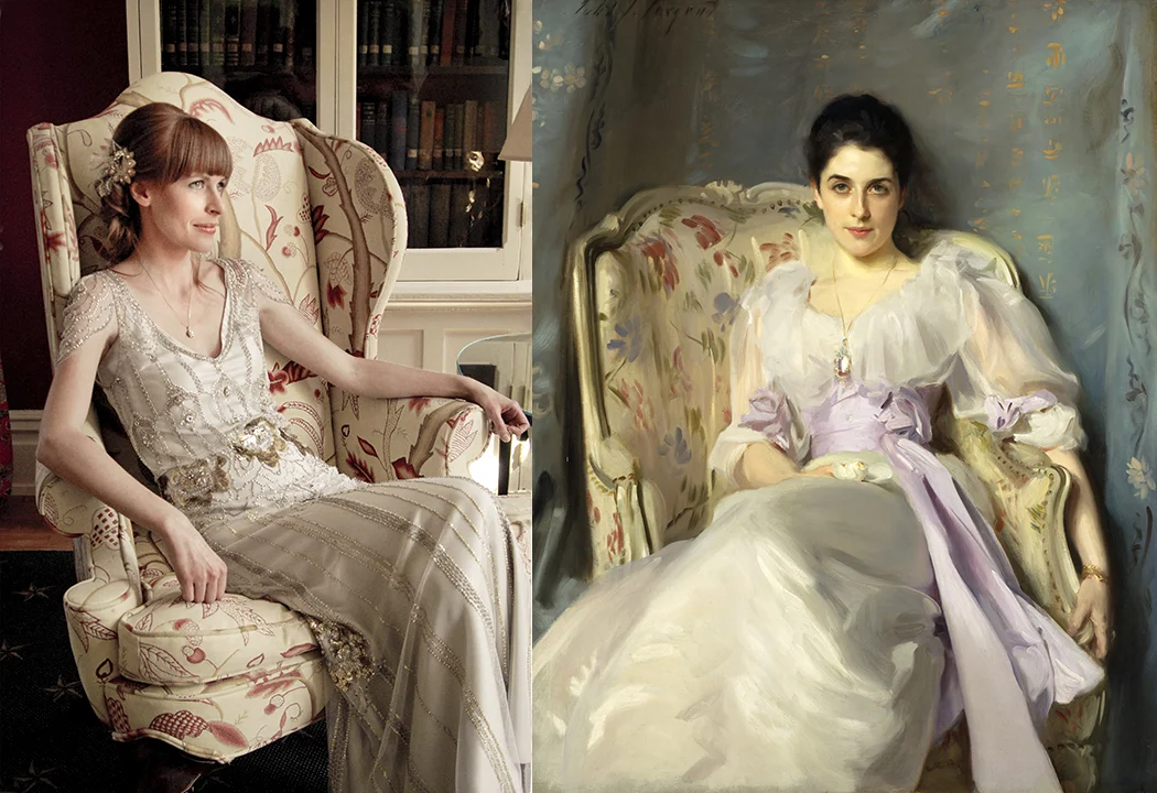 On the left: Wedding Photograph by Merrilee Luke-Ebbeler. On the right: John Singer Sargent, Lady Agnew of Lochnaw, 1892.